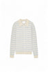 Introducing the JACKIE LONGSLEEVE POLO. This organic cotton cardigan features a textured knit with horizontal stripes and stitching, finished with Mother-of-Pearl buttons. Elevate your style with this playful polo. (Organic, textured, and oh so cool!)